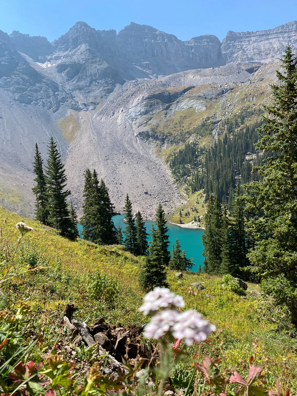 - What a beautiful hike, wildflowers, waterfalls, streams, cliffs, old mine, mountain views and the Lake at the end, green waters and a tall waterfall 😍 totally forgot altitude sickness!