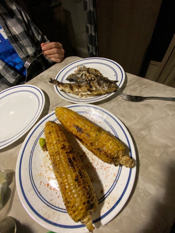 - Camp fire dinner : Mexican corn + Trout Stephen caught (super delicious! )